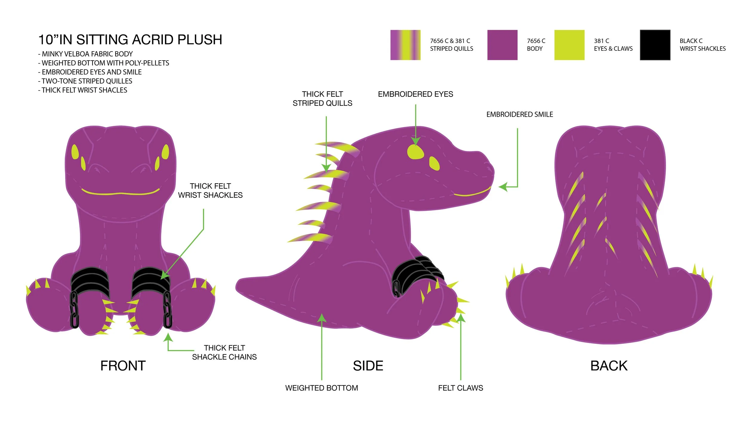 As a product designer, I was commissioned to create a plush version of Acrid from Risk of Rain 2. I developed the concept and translated it into a detailed tech pack, which guided the final plush through production.